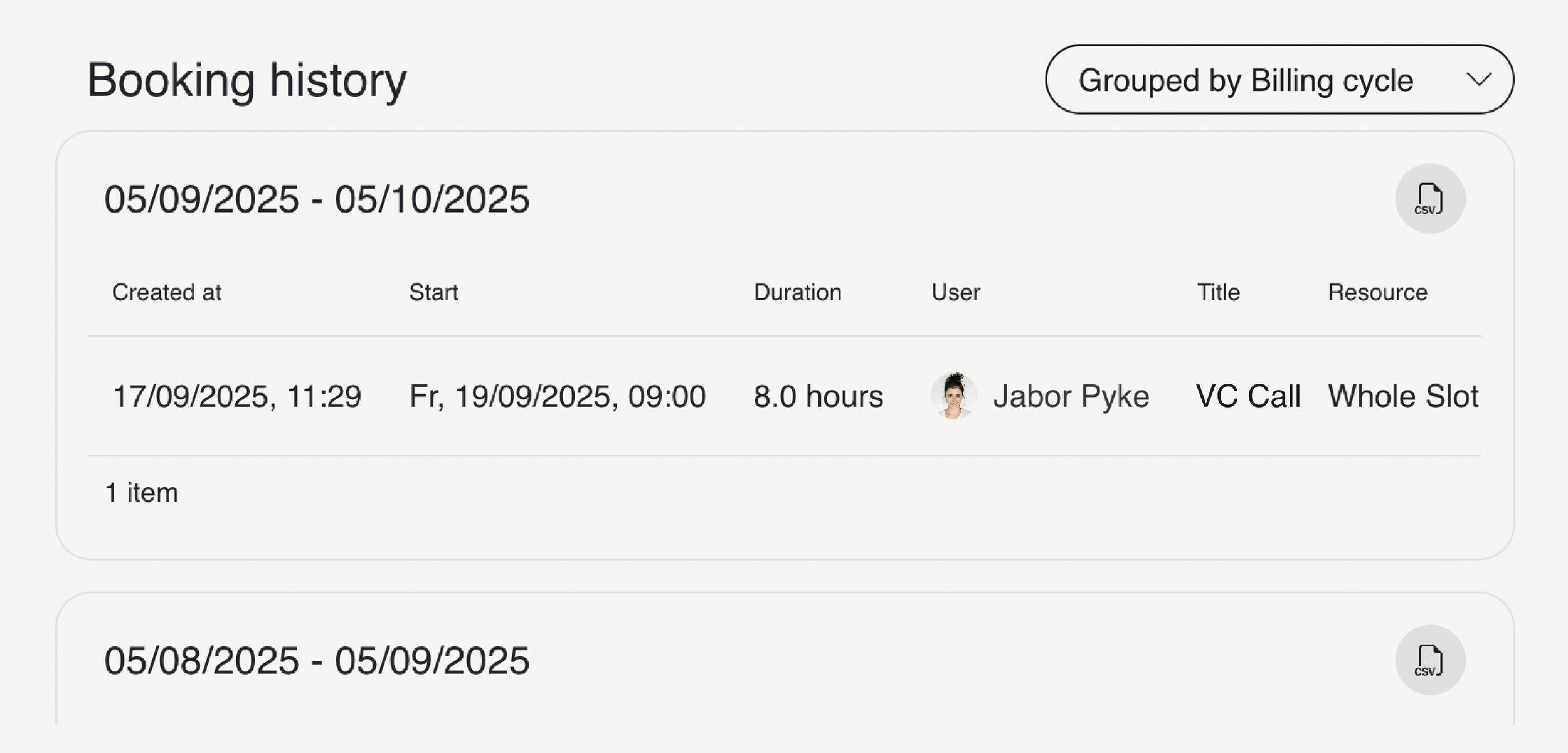 When viewing a member's profile, you can now group the booking history by billing cycles. Instead of a list, you will immediately see: